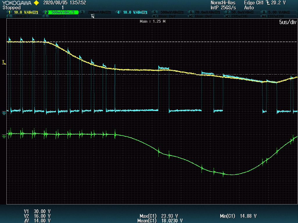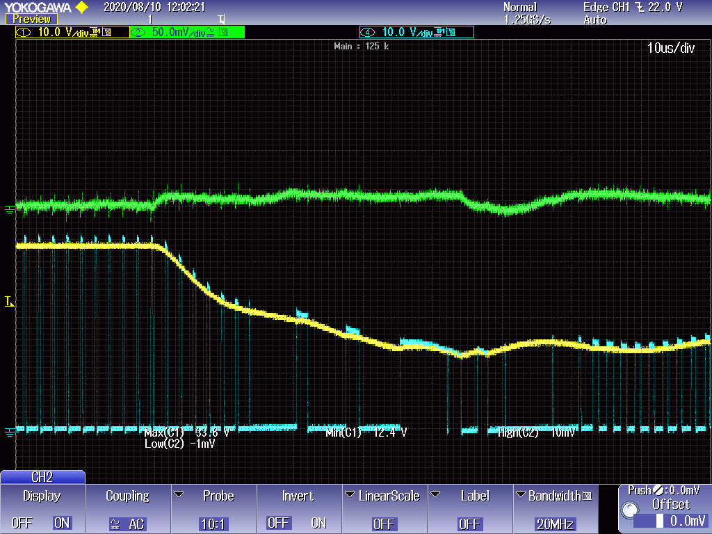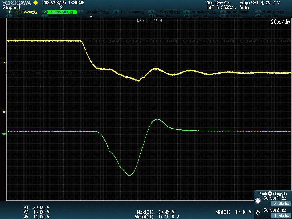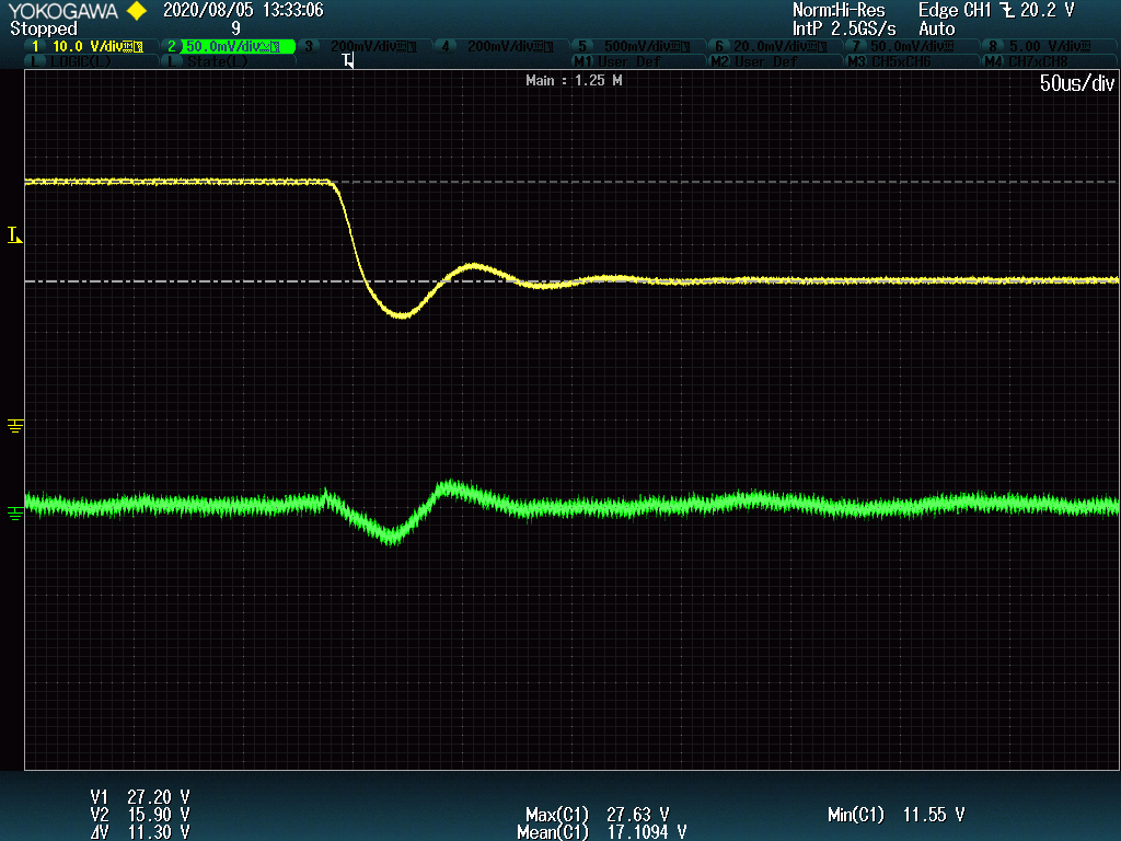 The above response was for an input step response from 27V to 16V. Channel 1 is input voltage and channel 2 is output voltage (AC coupled).
