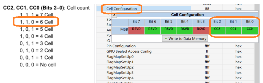 Customer use BQ40Z80 on 6S application; they get the right configuration for the connection, however, they find in the data memory -> settings page, the "cell configuration" register shows the wrong read back data "000" for CC2, CC1, CC0; which the correct should be “110”. They try to modify the register value, however it couldn't be changed, could you help us understand what's wrong and how to get the right result?