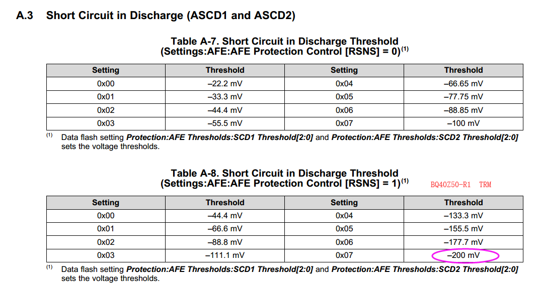 1. Can BQ40Z50-R1 detect discharge short circuit voltage when it's small than -0.2V and act short circuit protection turn off CHG and DSG MOS FET or DO NOT detect discharge short circuit voltage and do nothing?