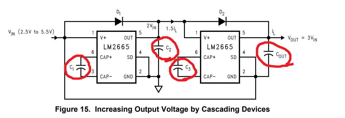 The capacitor selection is for the cascaded solution the same as for the simple voltage doubler. This information can be found in the datasheet on p.10.