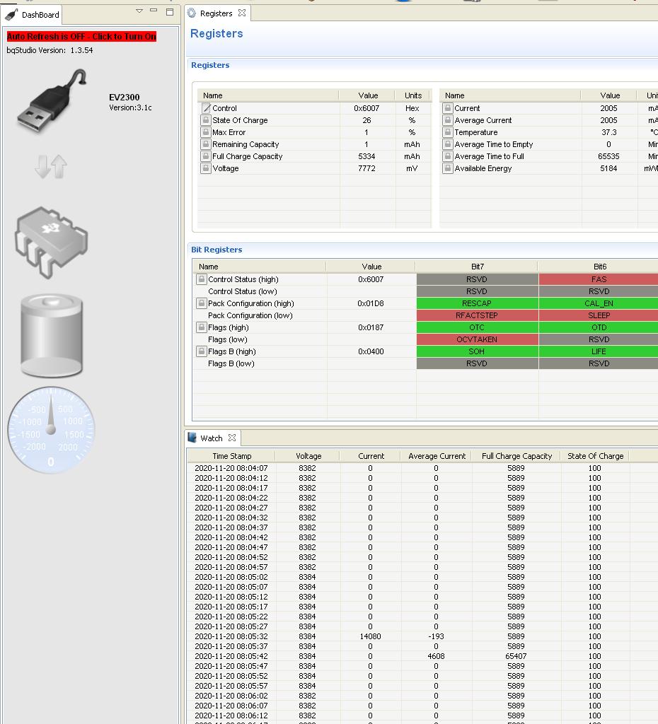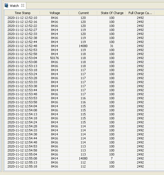 We have isolated the Bq34z100 from our MCU and we can manage fuel gauge by EV2300 HPA002 adapter and the application Battery Management Studio (bqStudio) 1.3.54. Using this application and Watch utility we log some of the battery parameters sampling at 5000 ms. Pls find attached image. Note that there are spurious error readings on Voltage, Current, State of Charge.