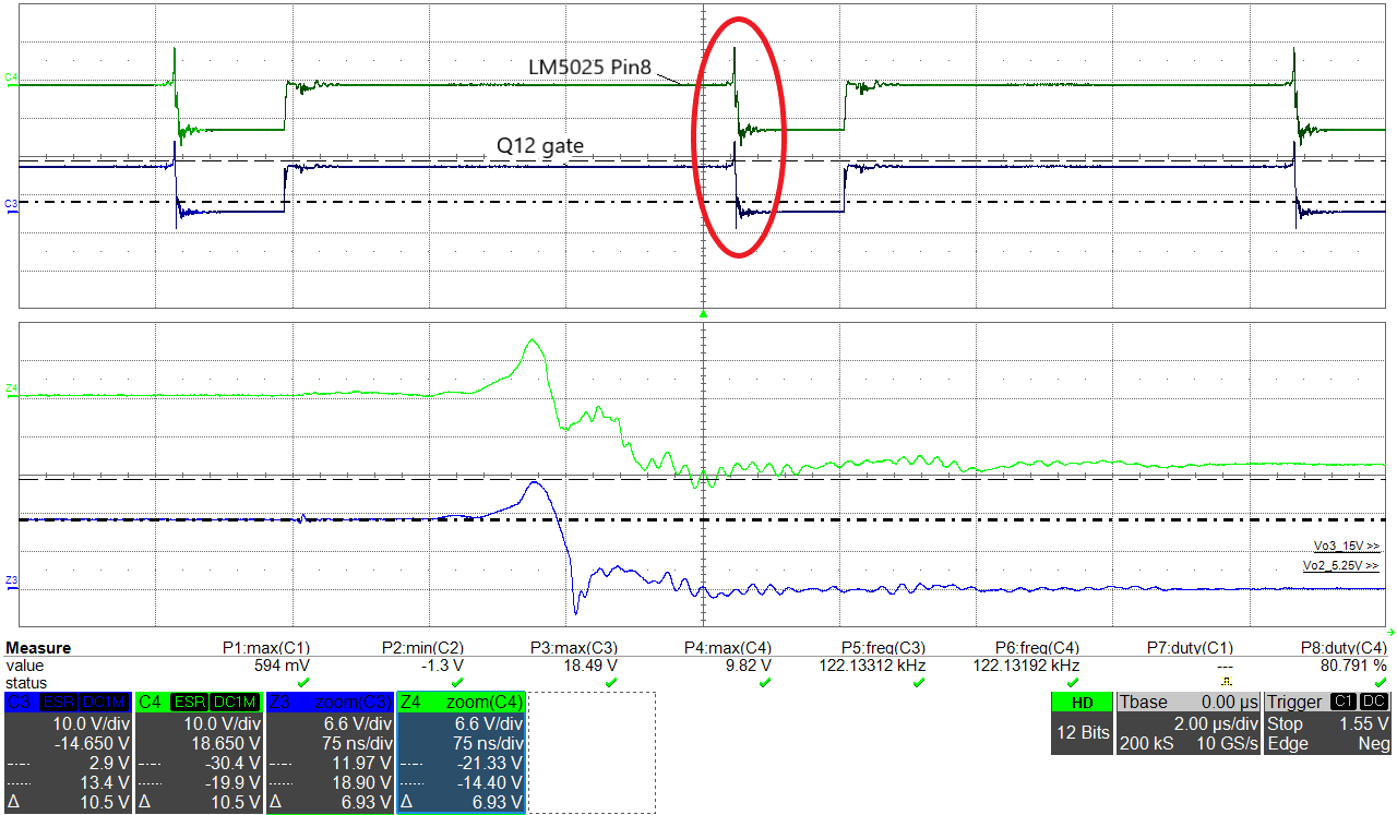 We checked the gate Q12 gate and IC pin8 as the waveforms there has the same question,