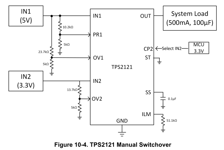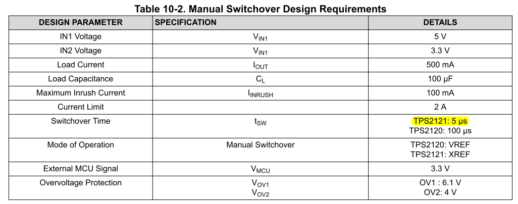 Customer want use TPS2121 "manual switchover" mode, they use MCU GPIO control the part CP2, and they need the fast switch feature to reduce the voltage dip at output. Experiment performed on TPS2121 EVM, find the following request: