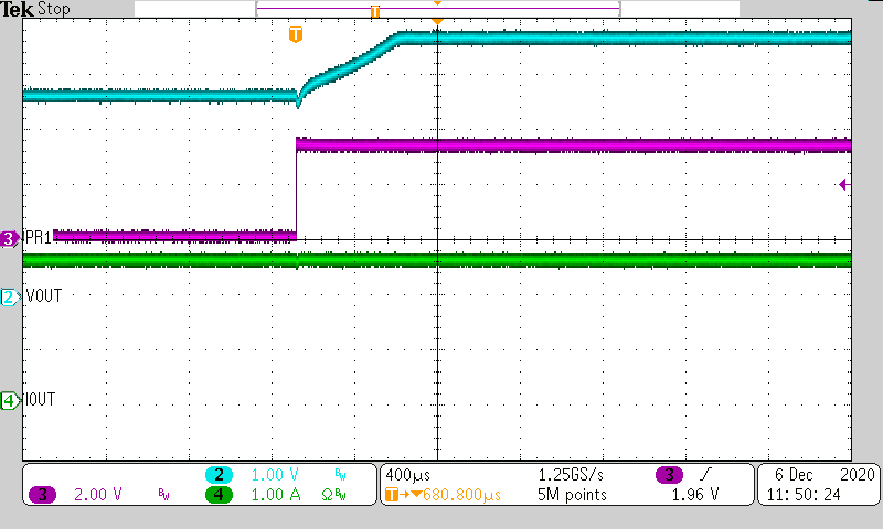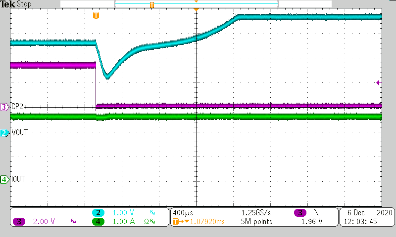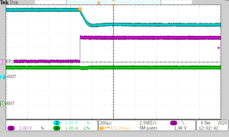 - EVM Vin1 = 5V, Vin2 = 4V; PR1 = EVM 3.3V connector operation(high) install jumper J1; CP2 control by GPIO; Output current = 2.5A;
