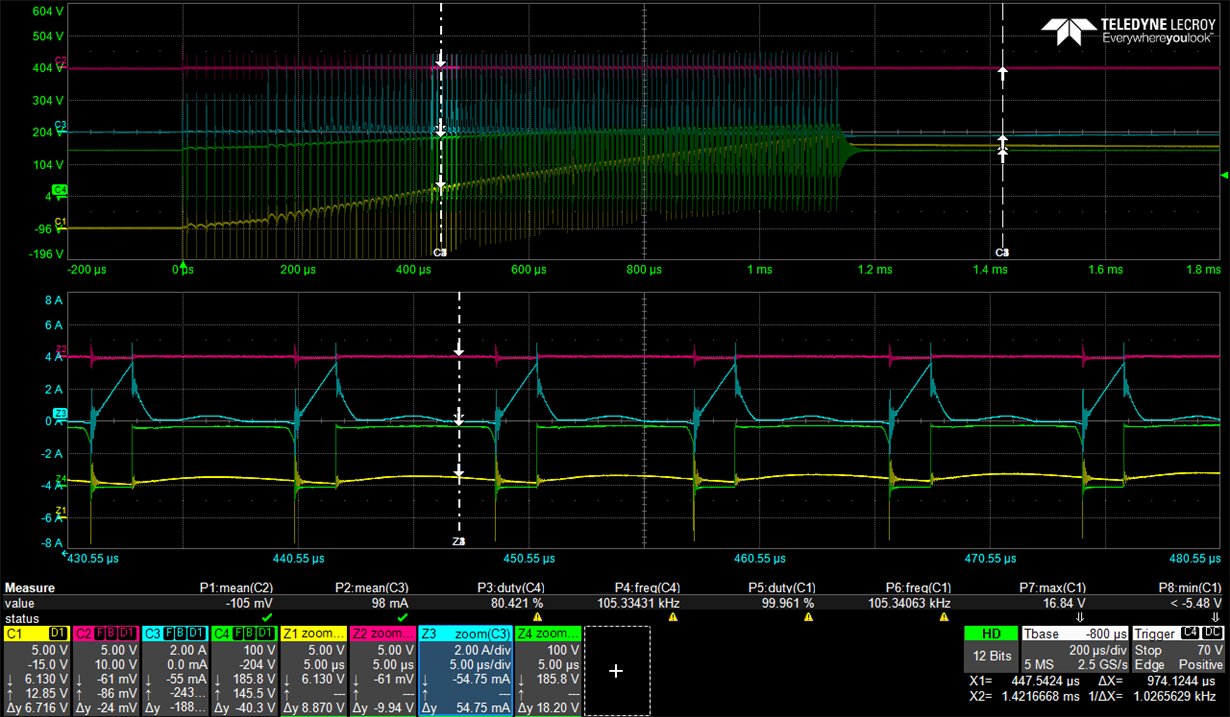 Once started, the converter behaves almost well (still having some issue between transition from ABM to AAM) and regulation is fine at full power.