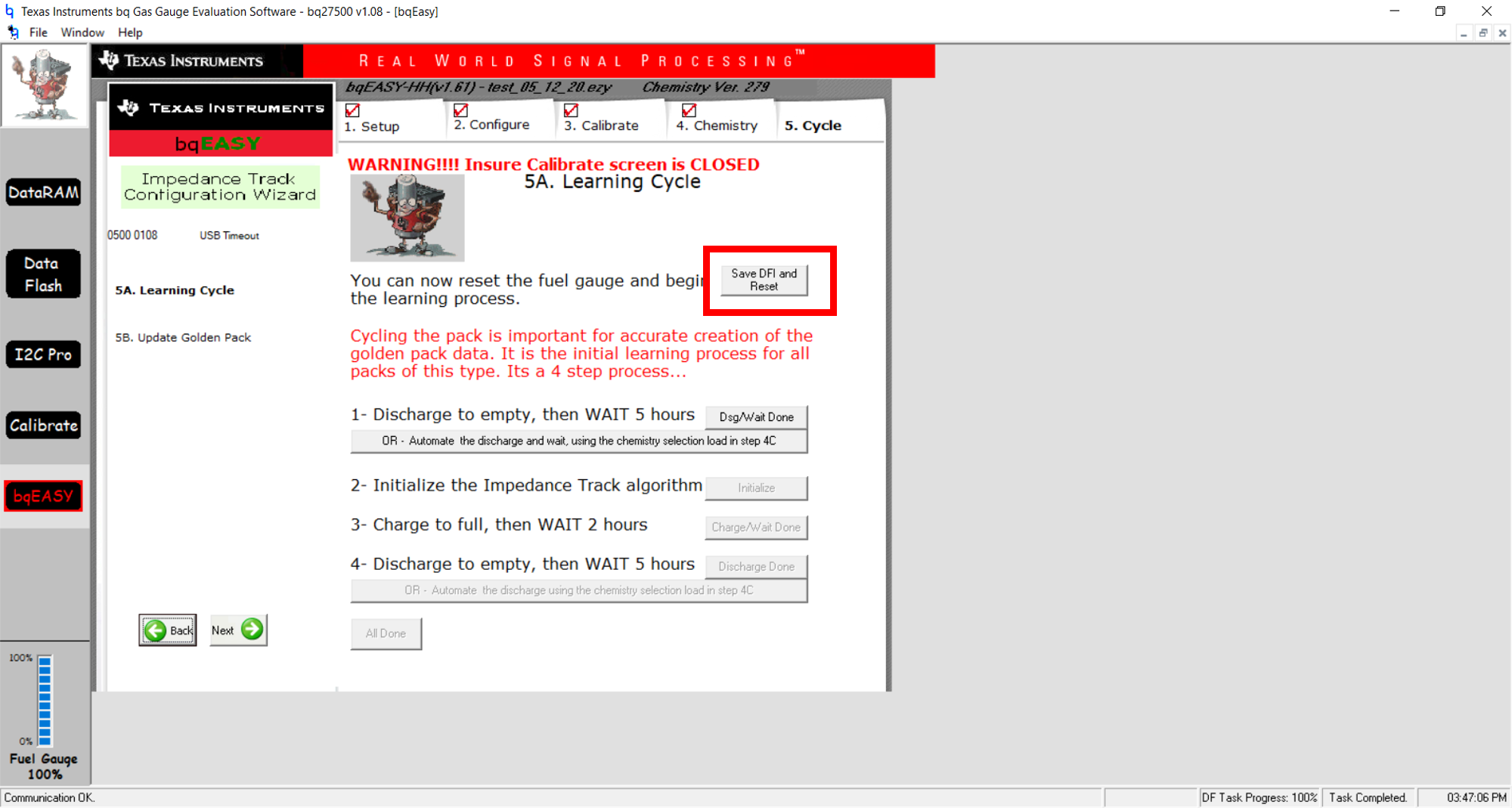 I have been trying for a while now to calibrate my fuel gauge using the bqEASY utility but every time I get to the cycle page and click the "Save DFI and Reset" I get the following error : "USB Timeout! Please check connections. For DFI read problem, verify device was never sealed". On the left hand side of the page it also says "0500 0108 USB Timeout".