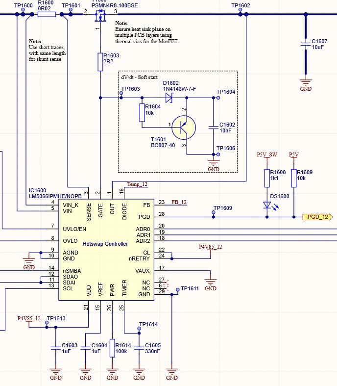 LM5066IEVM-626 board was modified to our needs.( VIN=28V; Max. current = 3A)