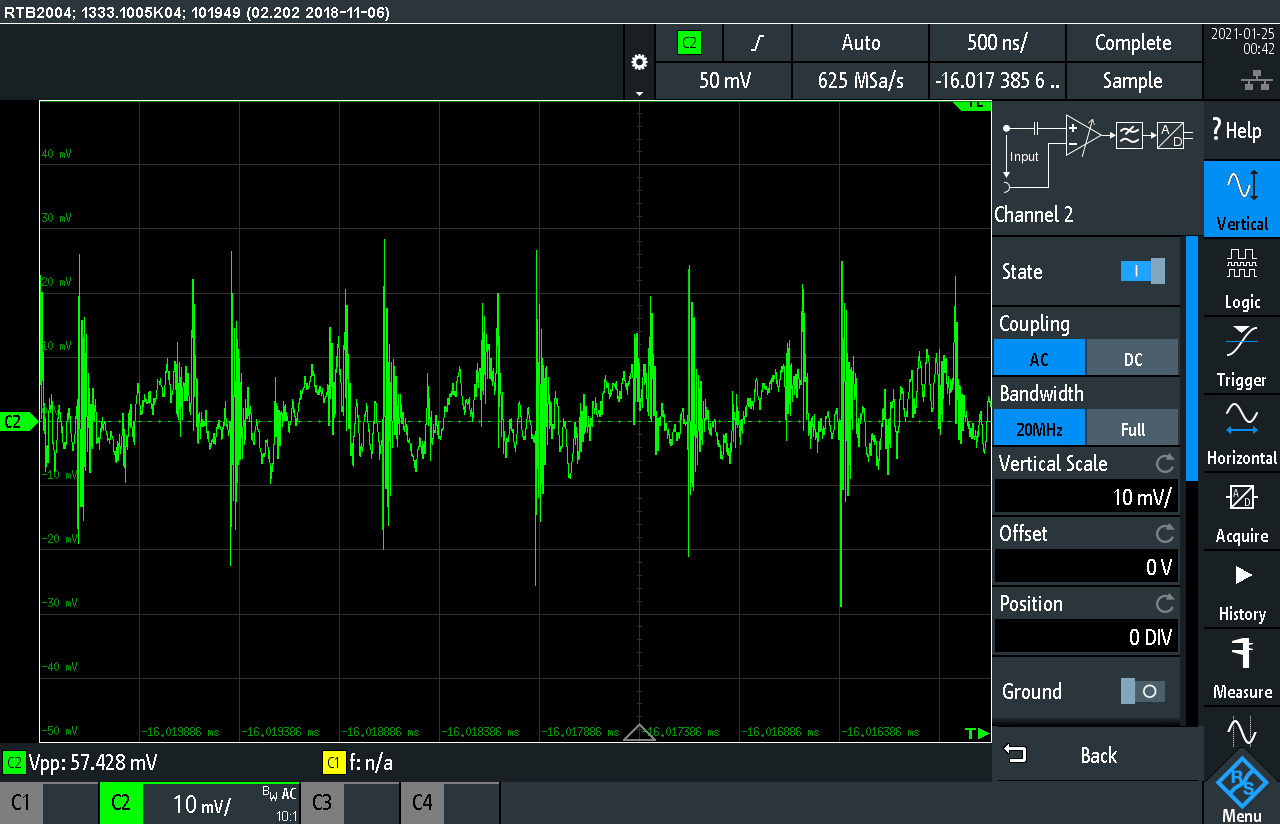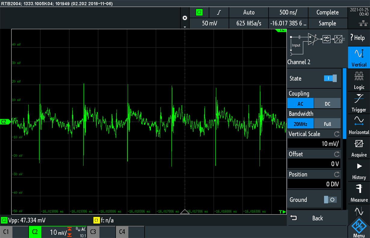 4) Vin under load has about +/-30mV p-p noise as shown in capture below