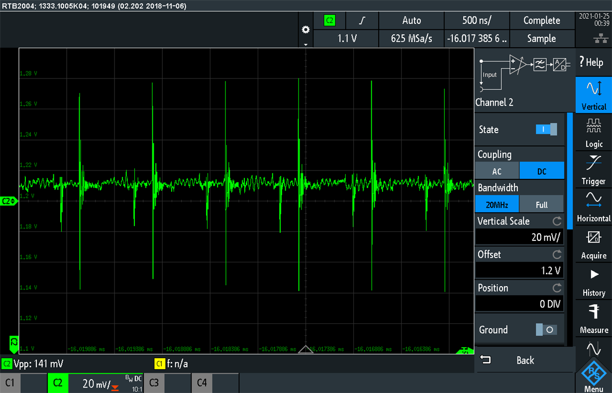 5) Vref under load remains about 1.21V with about +/-80mv p-p noise the noise as shown in capture below