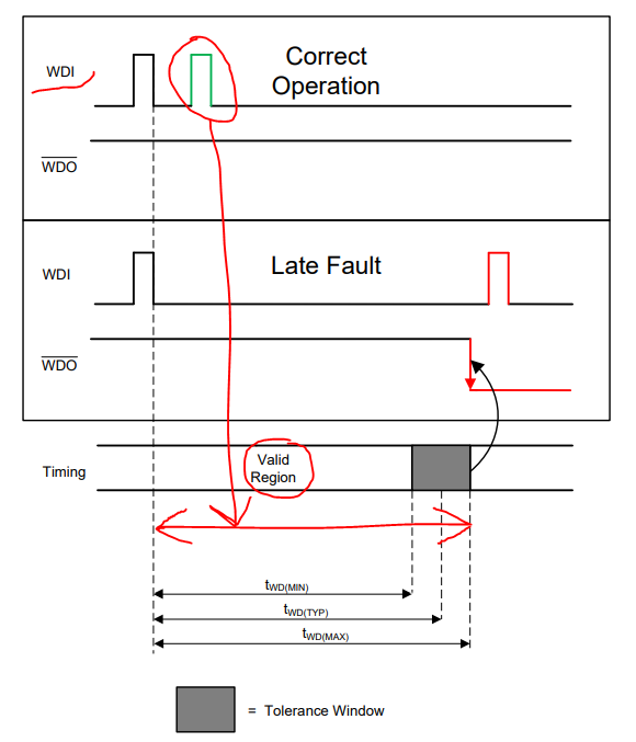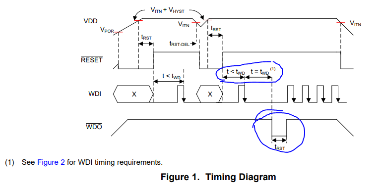 The figure above shows that the WDI negative edge clock needs to occur at t<tWD to ensure /WDO stays high.
