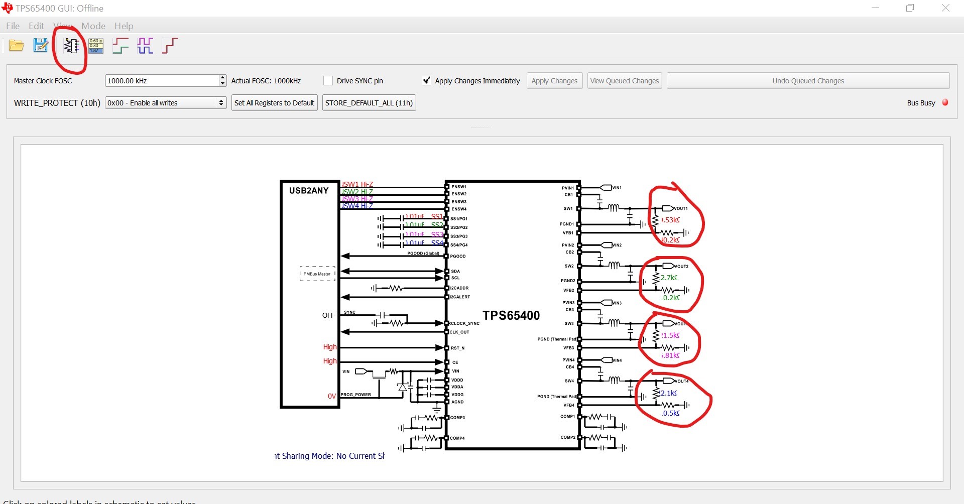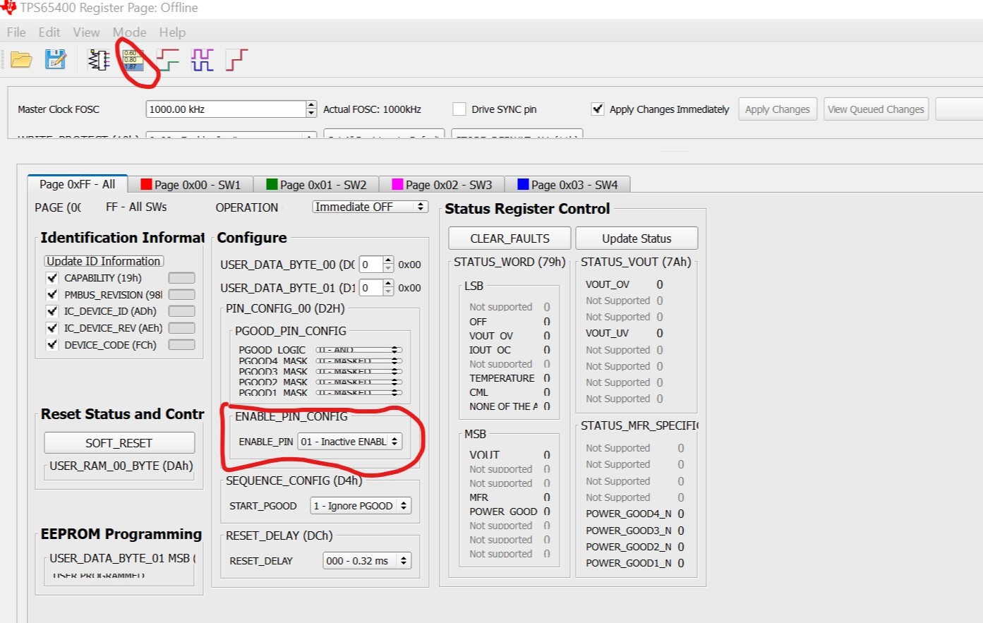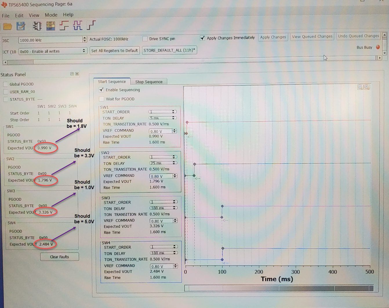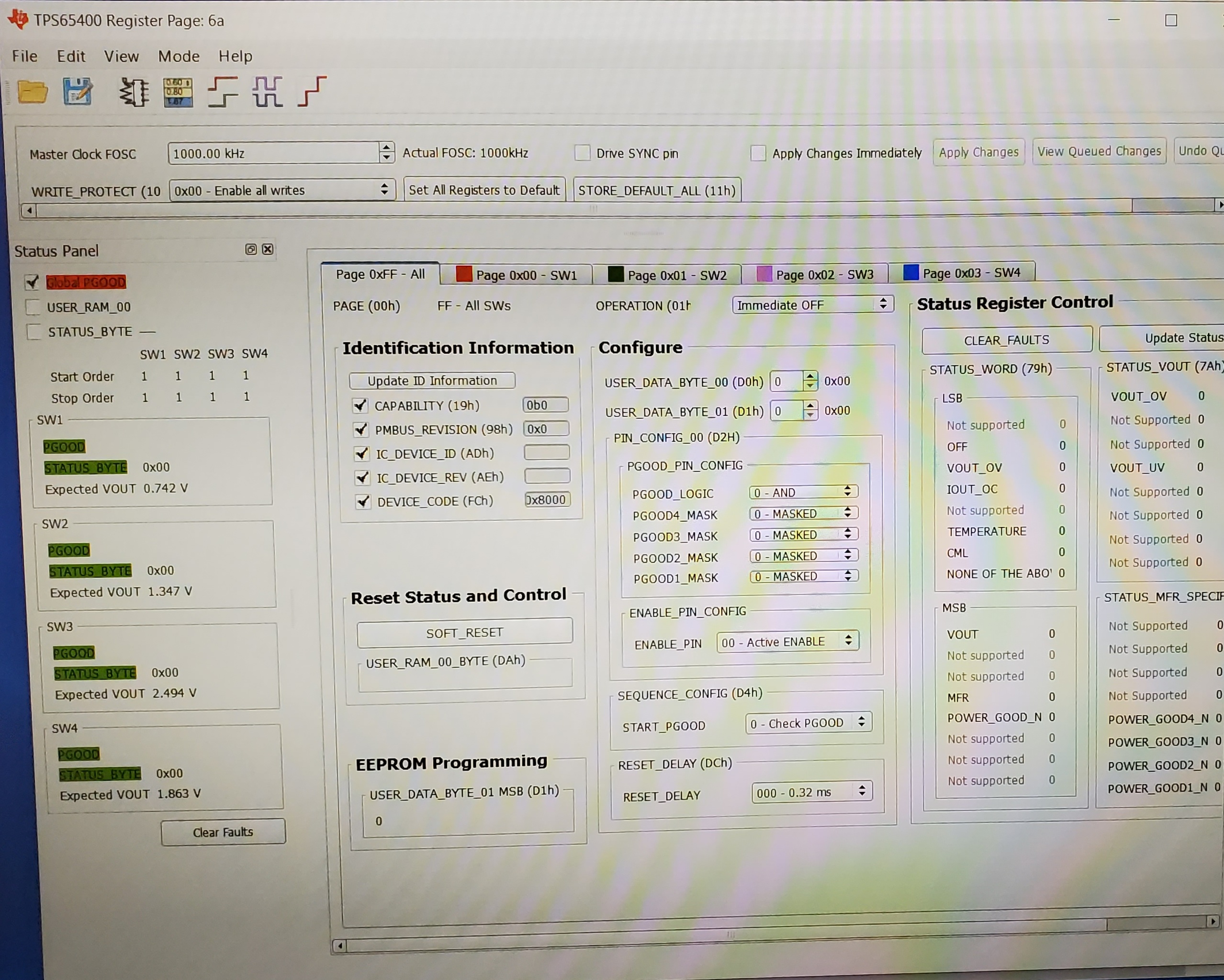 I currently have a PCB with a TPS65400 part, and EVM software recognizes the part. However, it does not control voltage output sequence or provide correct voltage output status. Can you please help to figure out why this is happening?