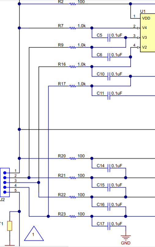 for example. V4 pin from the protection and VC4 pin from the gauge share the same R and C component
