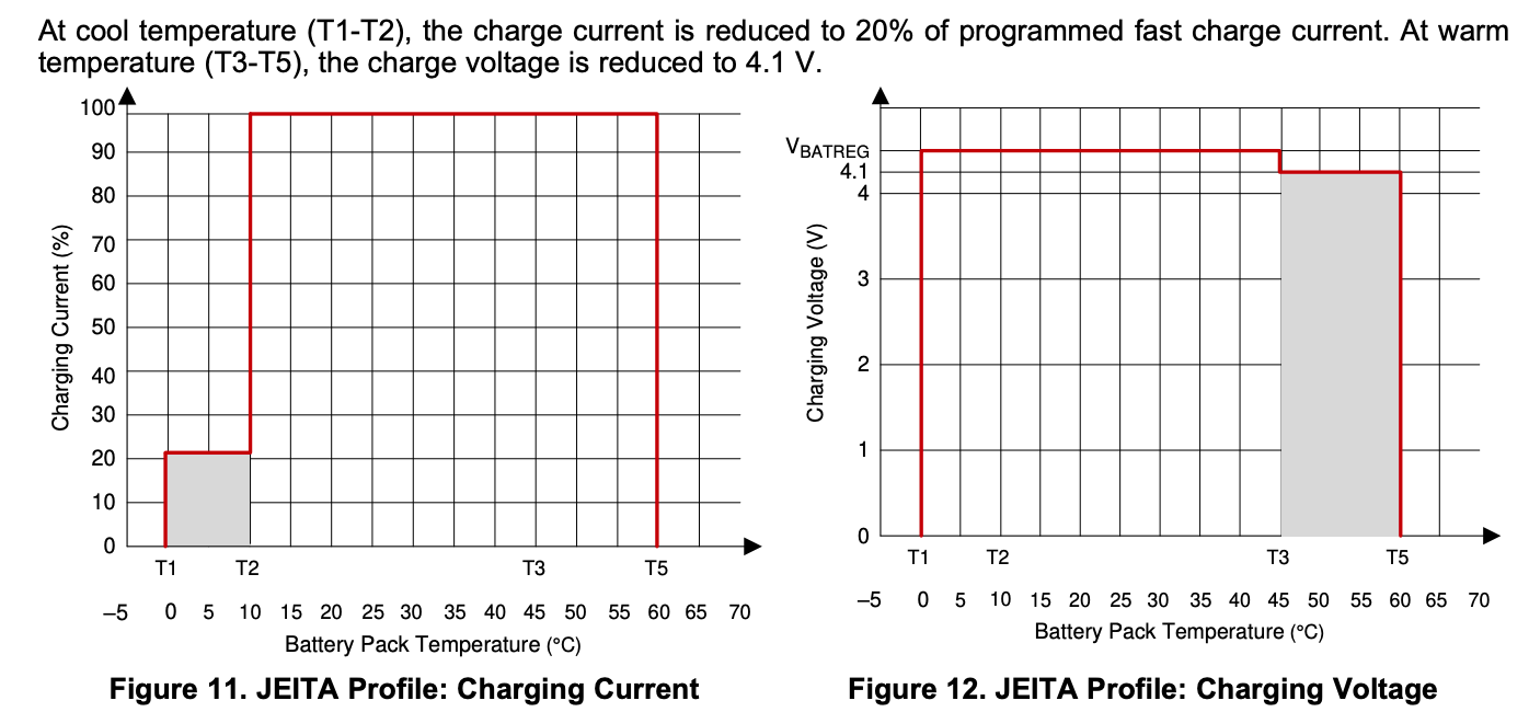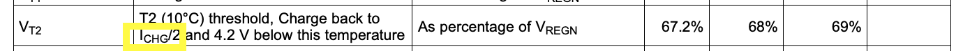There are 2 conflicting values in the datasheet for the charge current when operating in the 0-10C region. According to the plot it is 20% of charge current. But in the electrical characteristics, it is charge current /2 (50%).
