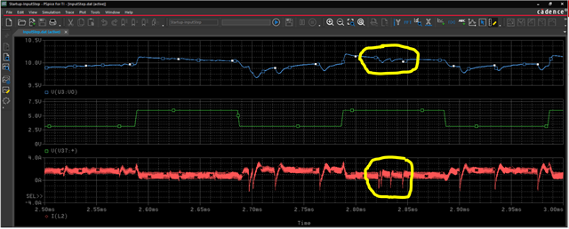 I notice dips in the switch current and output voltage when running the PSpice model on the TPS61378 web page.