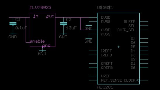 I am using a tlv70033 positive supply regulator (fixed to 3.3V). The supply is supposed to be low noise, and able to source 200 mA of current.