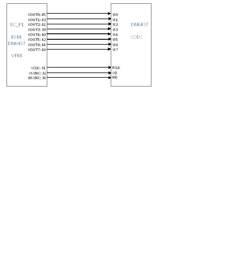 We have configured the VPBE of EVM-DM6437 in YCC8 display mode as directed in VPBE user guide. And we’ve also configured CCDC of DM6437 (customized board) in 8-bit YCbCr4:2:2 capture mode.