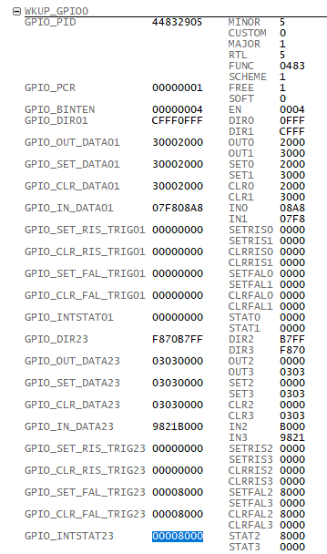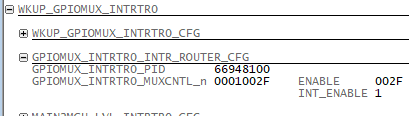 2. Enable WKUP_GPIOMUX_INTRTR0_MUXCNTL_n.INT_ENABLE at the same time, and WKUP_GPIOMUX_INTRTR0_MUXCNTL_n.ENABLE=47; and try 105