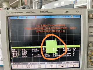 The DSP is used on the transceiver, so a 350 MHz RF signal is superimposed on the power rail in the transmit and receive state. At 4W emissions, this signal is tested with an oscilloscope with a large peak of 1VPP (the scope is tested with unlimited bandwidth, possibly spatial coupling effects measurements).