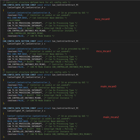 When debugging with canoe, only the two can in front of the initialization list can be sent. Only the first two can can be used, regardless of the initialization sequence, whether MCU_can or main_can. It also indicates that there is no problem with the hardware configuration of CAN. But this error will still occur. (On mcu3_0, the MCU_can interrupt is already mapped)