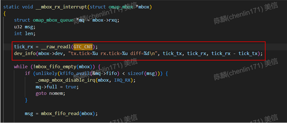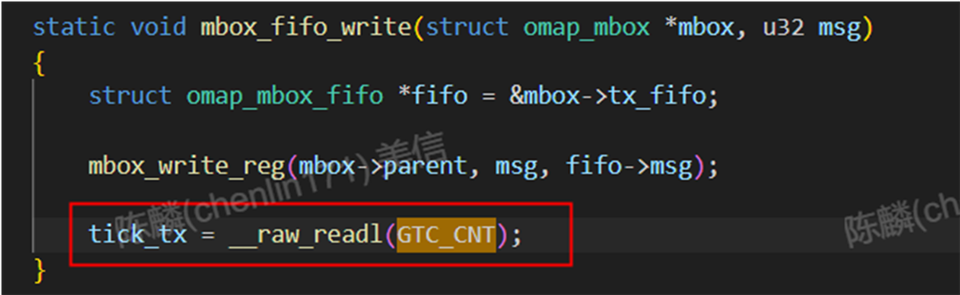 After the driver/mailbox/omap-mailbox.c sends out the tx, customer used below coding to record the GTC_CNT.