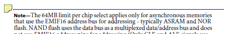 Explanation: due to the address line for EMIF which are 24 address lines, hence it can only address up to 16M of location. Each location has 2 bytes. Hence the c66 datasheet is also wrong in saying that it supports 16MB. It should be 16M of location or 32MB.