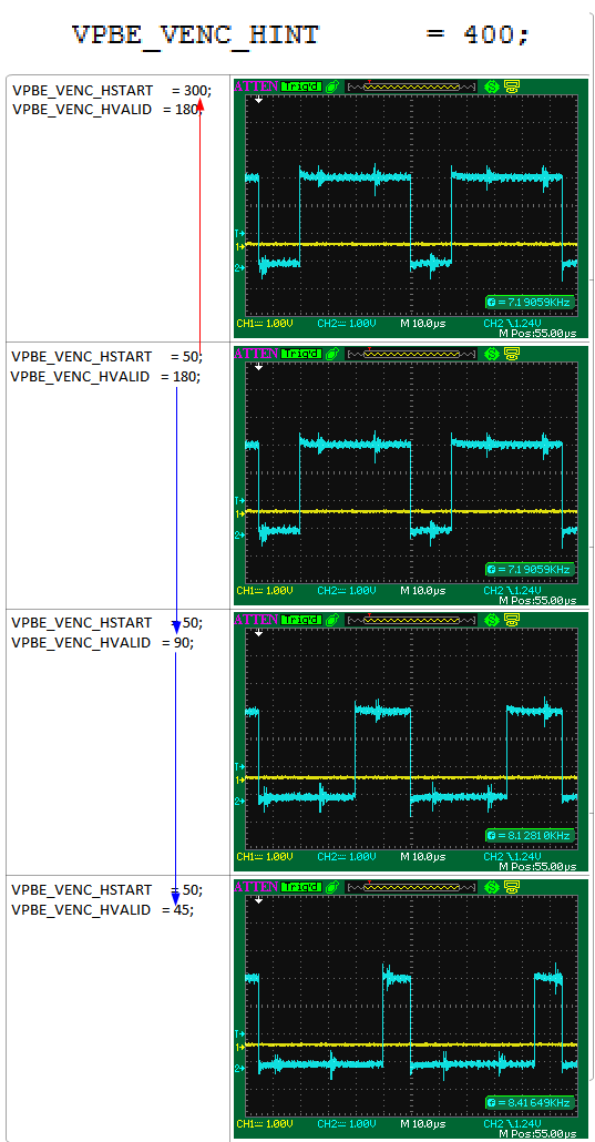 The comparison clearly shows that changing HVALID proportionally changes LCD_OE high time, whereas changing HSTART, note that although
