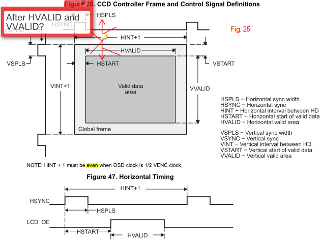 What is even more strange is that I cannot control the position of image block displayed on LCD screen, and the actual case is that they all start from physical pixel(0,0) regardless of HSTART and VSTART value. For parallel RGB output, as the document description (see figure below) shows, the valid data area (indicated by active LCD_OE) is determined by HSTART, HVALID, VSTART and VVALID, but in actual use HVALID (and VVALID) has no effect.