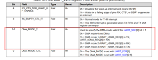 After running, I read the MCU_UART register before UART_write and before UART_close respectively, and found that the bit3 of the registers UART_FCR and bit2 of UART_SCR are 0. According to the description of the TRM document, these two bits are currently no dma. How do I determine whether uart DMA is enabled?