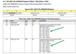 This weekend, we located that the output of LDO2 exceeded the threshold of VMON. When the VMON function of LDO2 was turned off, the fault no longer occurred. LDO2 is a 3.3V bypass output. By reading the register, the value of VMON UV&OV of LDO2 is ±5%/50mV. I want to confirm whether the output of LDO2 is based on ±5% of 3.3V or 50mV. If it is 3.3V, a 50mv fluctuation should be normal. Secondly, I want to confirm which voltage reference this fluctuation is based on, AMXOUT?