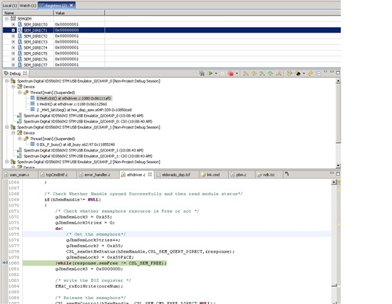 I am using the 6474 DSP and am working with NDK_2_0_0 and with high throughput loads the NDK gets stuck in HWRxInt() in ethdriver.c. I have attached a screen shot below. I read this post(http://e2e.ti.com/support/dsp/c6000_multi-core_dsps/f/439/t/51491.aspx?PageIndex=2) which states that if I move NDK_PACKETMEM to L2RAM these lockups should not occur. I have tried moving NDK_PACKETMEM in both DDR and L2RAM. Can you provide some guidance on how I can fix this problem.