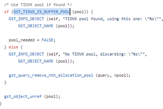 1.normal pipeline gst-launch-1.0 \ v4l2src device=/dev/video3 io-mode=5 ! \ video/x-bayer, width=1920, height=1280, format=bggr12, framerate=60/1 ! \ plugin ! \ tiovxisp sensor-name=SENSOR_OX3C \ dcc-isp-file=/opt/imaging/ox03c/dcc_viss_wdr.bin \ sink_0::dcc_2a_file=/opt/imaging/ox03c/dcc_2a_wdr.bin sink_0::device=/dev/v4l-subdev2 format-msb=11 \ sink_0::pool-size=2 src::pool-size=2 ! \ tiovxldc dcc-file=/opt/imaging/ox03c/dcc_ldc_wdr.bin sensor-name=SENSOR_OX3C \ sink::pool-size=2 src::pool-size=2 ! \ video/x-raw, format=NV12, width=1920, height=1280,framerate=60/1 ! queue ! \ kmssink driver-name=tidss async=false sync=false src-x=390 src-y=130 src-w=1290 src-h=770 can-scale=false 2.add self-developed gstreamer plugin gst-launch-1.0 \ v4l2src device=/dev/video3 io-mode=5 ! \ video/x-bayer, width=1920, height=1280, format=bggr12, framerate=60/1 ! \ ISPAlgorithm ! \ tiovxisp sensor-name=SENSOR_OX3C \ dcc-isp-file=/opt/imaging/ox03c/dcc_viss_wdr.bin \ sink_0::dcc_2a_file=/opt/imaging/ox03c/dcc_2a_wdr.bin sink_0::device=/dev/v4l-subdev2 format-msb=11 \ sink_0::pool-size=2 src::pool-size=2 ! \ tiovxldc dcc-file=/opt/imaging/ox03c/dcc_ldc_wdr.bin sensor-name=SENSOR_OX3C \ sink::pool-size=2 src::pool-size=2 ! \ video/x-raw, format=NV12, width=1920, height=1280,framerate=60/1 ! queue ! \ kmssink driver-name=tidss async=false sync=false src-x=390 src-y=130 src-w=1290 src-h=770 can-scale=false 3.Error message root@am62axx-evm:/usr/local/apd/scripts# gst-launch-1.0 \ > v4l2src device=/dev/video3 io-mode=5 ! \ > video/x-bayer, width=1920, height=1280, format=bggr12, framerate=60/1 ! \ > ISPAlgorithm ! \ > tiovxisp sensor-name=SENSOR_OX3C \ > dcc-isp-file=/opt/imaging/ox03c/dcc_viss_wdr.bin \ > sink_0::dcc_2a_file=/opt/imaging/ox03c/dcc_2a_wdr.bin sink_0::device=/dev/v4l-subdev2 format-msb=11 \ > sink_0::pool-size=2 src::pool-size=2 ! \ > tiovxldc dcc-file=/opt/imaging/ox03c/dcc_ldc_wdr.bin sensor-name=SENSOR_OX3C \ > sink::pool-size=2 src::pool-size=2 ! \ > video/x-raw, format=NV12, width=1920, height=1280,framerate=60/1 ! queue ! \ > kmssink driver-name=tidss async=false sync=false src-x=390 src-y=130 src-w=1290 src-h=770 can-scale=false APP: Init ... !!! MEM: Init ... !!! MEM: Initialized DMA HEAP (fd=6) !!! MEM: Init ... Done !!! IPC: Init ... !!! IPC: Init ... Done !!! REMOTE_SERVICE: Init ... !!! REMOTE_SERVICE: Init ... Done !!! 894.402447 s: GTC Frequency = 200 MHz APP: Init ... Done !!! 894.402588 s: VX_ZONE_INIT:Enabled 894.402615 s: VX_ZONE_ERROR:Enabled 894.402672 s: VX_ZONE_WARNING:Enabled 894.403578 s: VX_ZONE_INIT:[tivxPlatformCreateTargetId:116] Added target MPU-0 894.404138 s: VX_ZONE_INIT:[tivxPlatformCreateTargetId:116] Added target MPU-1 894.404609 s: VX_ZONE_INIT:[tivxPlatformCreateTargetId:116] Added target MPU-2 894.405213 s: VX_ZONE_INIT:[tivxPlatformCreateTargetId:116] Added target MPU-3 894.405296 s: VX_ZONE_INIT:[tivxInitLocal:136] Initialization Done !!! 894.406151 s: VX_ZONE_INIT:[tivxHostInitLocal:101] Initialization Done for HOST !!! Setting pipeline to PAUSED ... Pipeline is live and does not need PREROLL ... Redistribute latency... Pipeline is PREROLLED ... Setting pipeline to PLAYING ... New clock: GstSystemClock ERROR: from element /GstPipeline:pipeline0/GstV4l2Src:v4l2src0: No downstream pool to import from. Additional debug info: ../gst-plugins-good-1.20.7/sys/v4l2/gstv4l2object.c(5305): gst_v4l2_object_decide_allocation (): /GstPipeline:pipeline0/GstV4l2Src:v4l2src0: When importing DMABUF or USERPTR, we need a pool to import from Execution ended after 0:00:00.001277535 Setting pipeline to NULL ... ERROR: from element /GstPipeline:pipeline0/GstV4l2Src:v4l2src0: Internal data stream error. Additional debug info: ../gstreamer-1.20.7/libs/gst/base/gstbasesrc.c(3127): gst_base_src_loop (): /GstPipeline:pipeline0/GstV4l2Src:v4l2src0: streaming stopped, reason not-negotiated (-4) (gst-launch-1.0:1397): GStreamer-Video-CRITICAL **: 18:11:34.918: gst_video_info_from_caps: assertion 'caps != NULL' failed ERROR: from element /GstPipeline:pipeline0/GstTIOVXISP:tiovxisp0: Unable to init TIOVX module Additional debug info: ../gst-libs/gst/tiovx/gsttiovxmiso.c(1512): gst_tiovx_miso_negotiated_src_caps (): /GstPipeline:pipeline0/GstTIOVXISP:tiovxisp0 Freeing pipeline ... 894.455631 s: VX_ZONE_INIT:[tivxHostDeInitLocal:115] De-Initialization Done for HOST !!! 894.459304 s: VX_ZONE_INIT:[tivxDeInitLocal:204] De-Initialization Done !!! APP: Deinit ... !!! REMOTE_SERVICE: Deinit ... !!! REMOTE_SERVICE: Deinit ... Done !!! IPC: Deinit ... !!! IPC: DeInit ... Done !!! MEM: Deinit ... !!! DDR_SHARED_MEM: Alloc's: 0 alloc's of 0 bytes DDR_SHARED_MEM: Free's : 0 free's of 0 bytes DDR_SHARED_MEM: Open's : 0 allocs of 0 bytes MEM: Deinit ... Done !!! APP: Deinit ... Done !!!