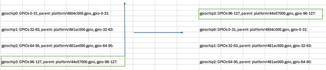 Correct: GPIO3 is used with 481ae000 gpiochip0: GPIOs 0-31, parent: platform/44e07000.gpio, gpio-0-31: gpiochip1: GPIOs 32-63, parent: platform/4804c000.gpio, gpio-32-63: gpiochip2: GPIOs 64-95, parent: platform/481ac000.gpio, gpio-64-95: gpiochip3: GPIOs 96-127, parent: platform/481ae000.gpio, gpio-96-127: gpio-105 ( |ksz8895 irq ) in hi IRQ gpio-106 ( |ksz8895 reset ) out lo |