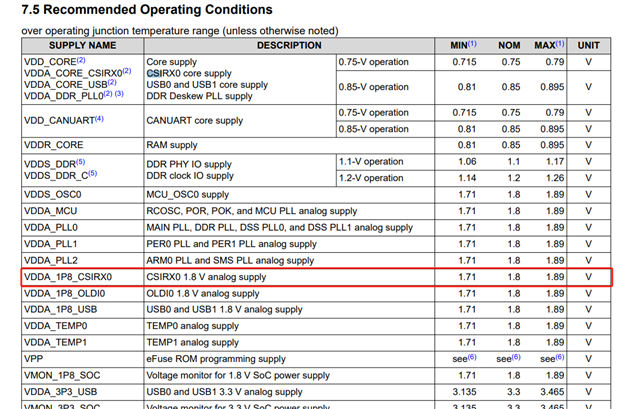 In the AM620-Q1 data manual, it is recommended that the voltage of VDDA_1P8_CSIRX0 be 1.8V. If a MIPI camera with 1.1V or 1.2V is connected, does it require level conversion? At the same time, CSIRX0 is compatible with MIPI DPHY v1.2 on 7.8.8. From here, it can be directly connected to a 1.1V or 1.2V MIPI camera. Which of these two information should be used?