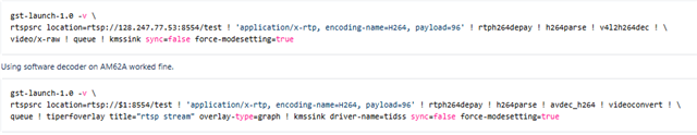 Their target is to streaming H.264 video streams through RTSP from PC to AM62A SK EVM, and decode it in AM62A SK EVM and display it through monitor connected to AM62A SK EVM, but failed with below log.