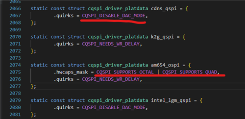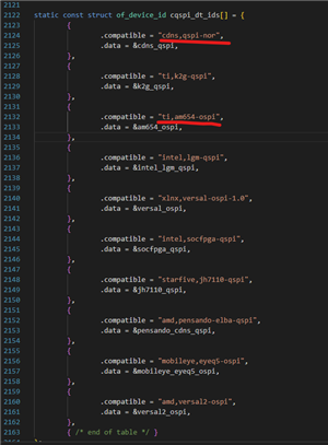 Within the kernel, I examined TI's low-level OSPI driver located at: linux-kernel/drivers/spi/spi-cadence-quadspi.c