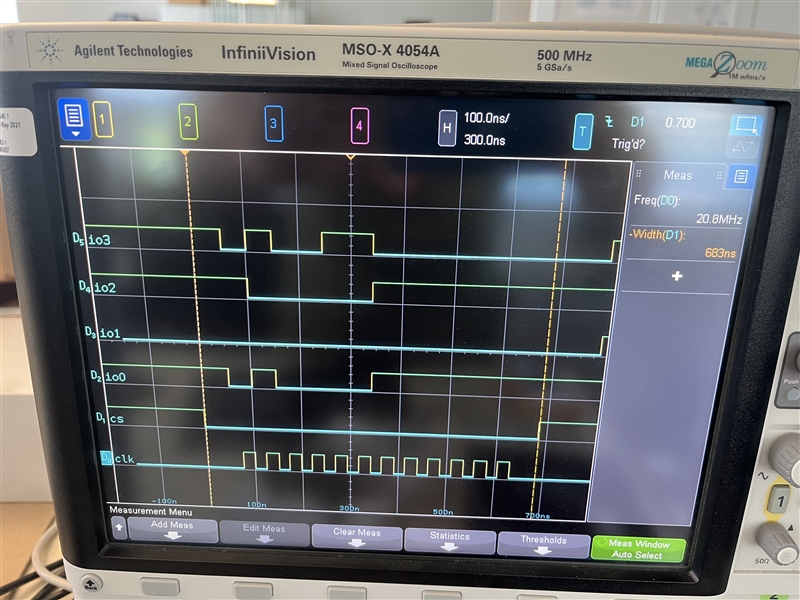static int fpga_qspi_write(struct spi_mem *mem) { u8 tx_buf[16] = { 0x00, 0x01, 0x02, 0x03, 0x04, 0x05, 0x06, 0x07, 0x08, 0x09, 0x0A, 0x0B, 0x0C, 0x0D, 0x0E, 0x0F }; int ret; struct spi_mem_op op = (struct spi_mem_op)SPI_MEM_OP( SPI_MEM_OP_CMD(0x55, 4), // CMD SPI_MEM_OP_ADDR(3, 0x00AA55, 4), // 3-byte address (1-bit lines) SPI_MEM_OP_NO_DUMMY, SPI_MEM_OP_DATA_OUT(16, tx_buf, 4) // 16-byte write over 4-bit bus ); if (!spi_mem_supports_op(mem, &op)) { dev_err(&mem->spi->dev, "spi_mem_supports_op() for writing failed!\n"); return -EOPNOTSUPP; } ret = spi_mem_exec_op(mem, &op); if (ret) { dev_err(&mem->spi->dev, "spi_mem_exec_op() failed for write operation: %d\n", ret); return ret; } return 0; }