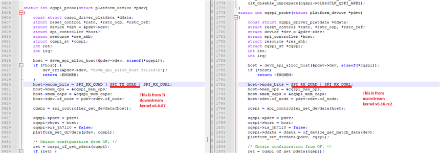 3. When comparing TI’s spi-cadence-quadspi driver in the TI repository versus the one in the mainline Linux kernel, which repository offers broader feature support? Shall we go with linux main stream instead of TI's downstream?