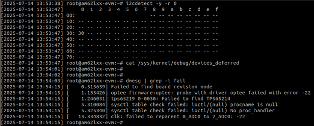 We are currently working with the TPS65214 PMIC on our custom AM62L3-based board. The PMIC is powered with a 5V input, and we are using GPIO0 (pin number 105) as the interrupt line connected to the SoC.
