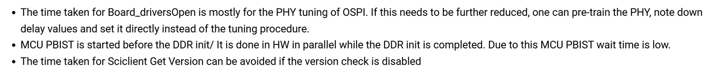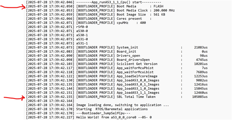I measured the time it took for the OSPI SBL in the SDK to boot up, load other core, and then run the A53 core. It takes about 600ms, which is too long. I want to know where this time is spent and whether it can be optimized. Here are our testing procedures: