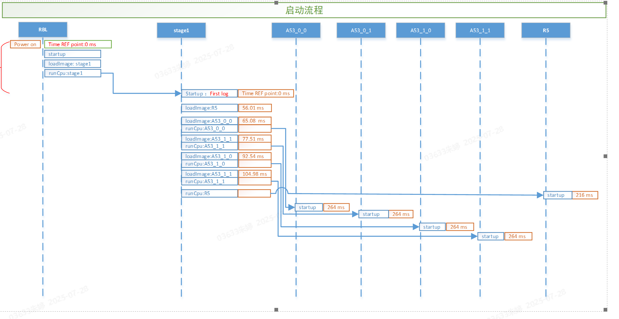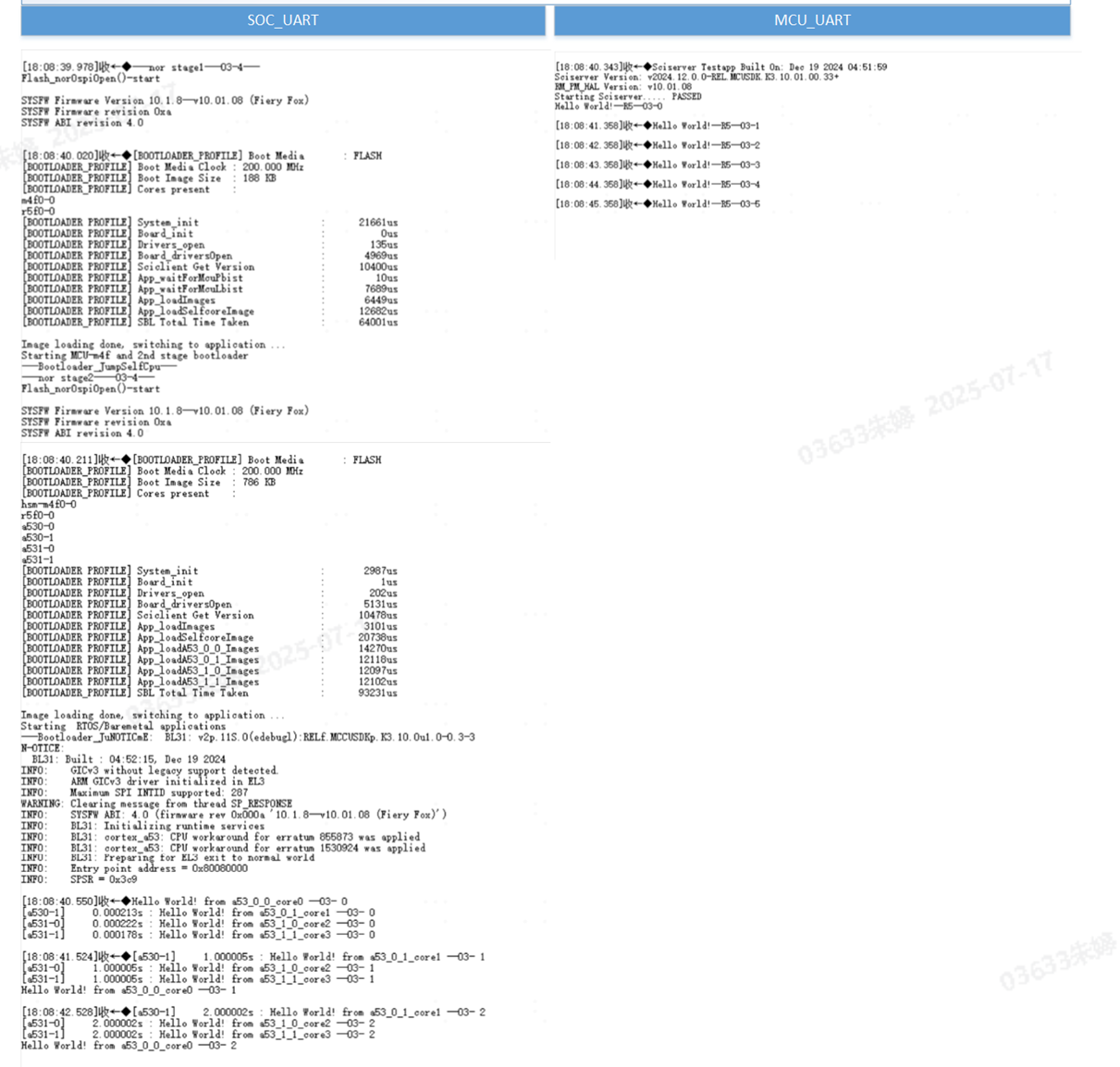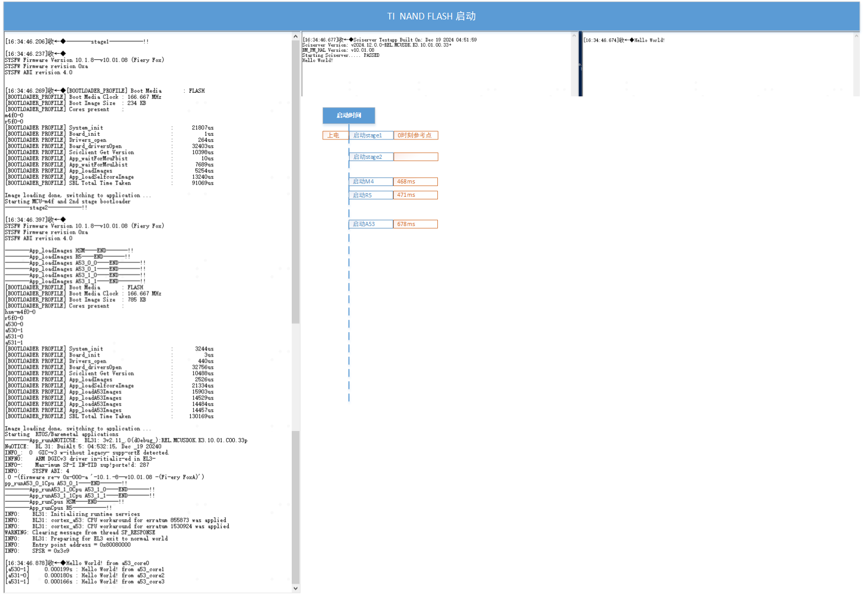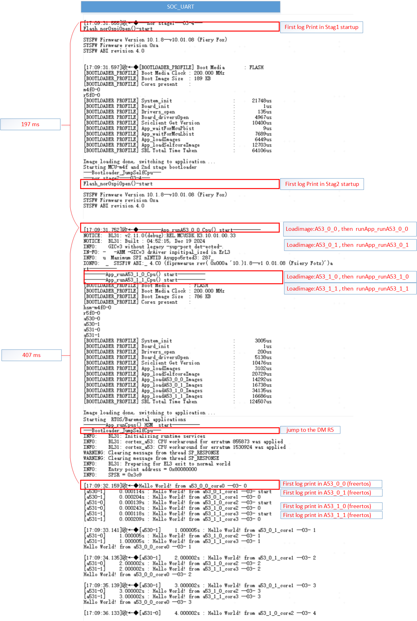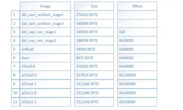 3. In the boot mode, use the ospi mode. Power on, check the serial port output log to observe the startup time of each image and the execution time of each module. Below are the test data.