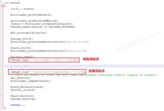 1. Add serial port test points to the examples. After completing the serial port initialization in the main() function, add a start test point, and add an end test point before performing the image jump.