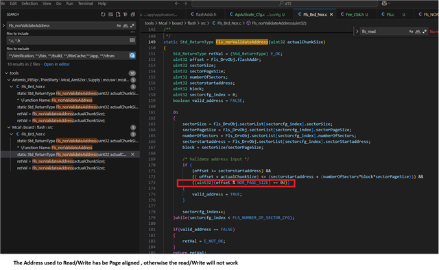 1) The Fls_Read from mcal_am275x_11_01_00_03 Driver is expecting the source address to be Page aligned.