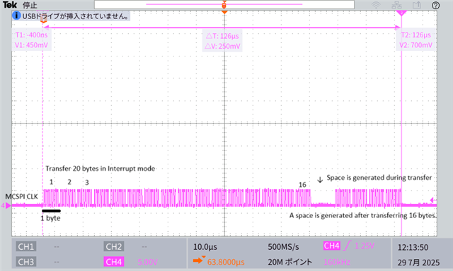 In Interrupt mode, there seems to be a wait after 16 bytes.