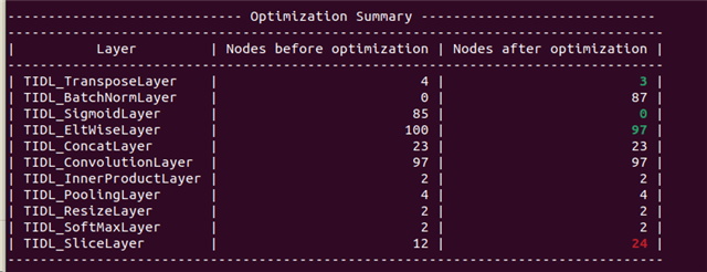 We can see red and green colors in the "Nodes after optimization" graph. Does the red color here represent unsupported operators? However, I checked github.com/.../custom_model_evaluation.md and found that TIDL_SliceLayer is supported.