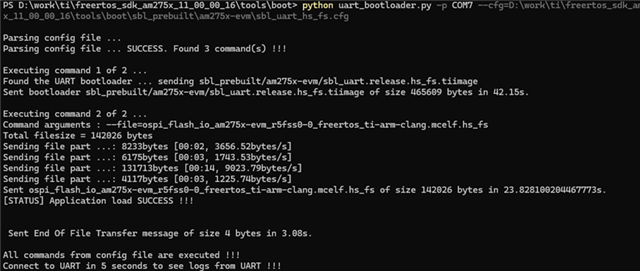 2. When replacing the SD card’s tiboot3.bin with sbl_null.release.hs_fs.tiimage from: freertos_sdk_am275x_11_00_00_16\tools\boot\sbl_prebuilt\am275x-evm, initialization logs are visible via the WAKEUP-COM port in TI EVM.