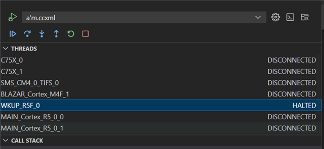 from the AWE SDK project, JTAG connects only to the WAKEUP R5F core. ospi_flash_diag_am275x-evm_wkup-r5fss0-0_freertos_ti-arm-clang can run normally