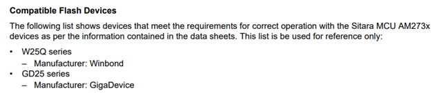 There are differences between the compatible Flash device listed in the AM273x QSPI Flash Selection Guide and the AM273x Hardware Design Guide. Which one is correct?