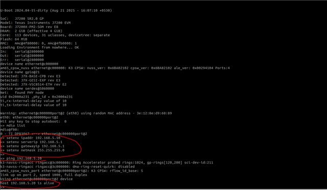 Out of the Box, on DRA821, only CPSW2G is enabled in U-Boot, while CPSW5G remains disabled.