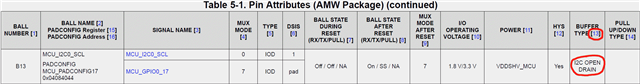 2. In sprsp96a Table 5-1 the following pins are listed as (only) having a buffer type "I2C OPEN DRAIN":