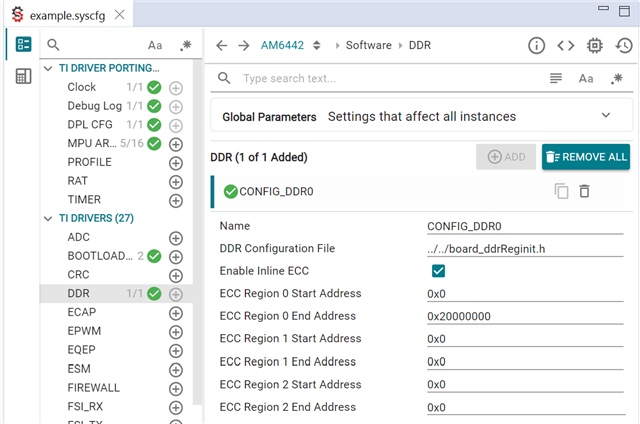 According to docs, ddr should be configured here in sbl -> ddr: disable/enable ecc